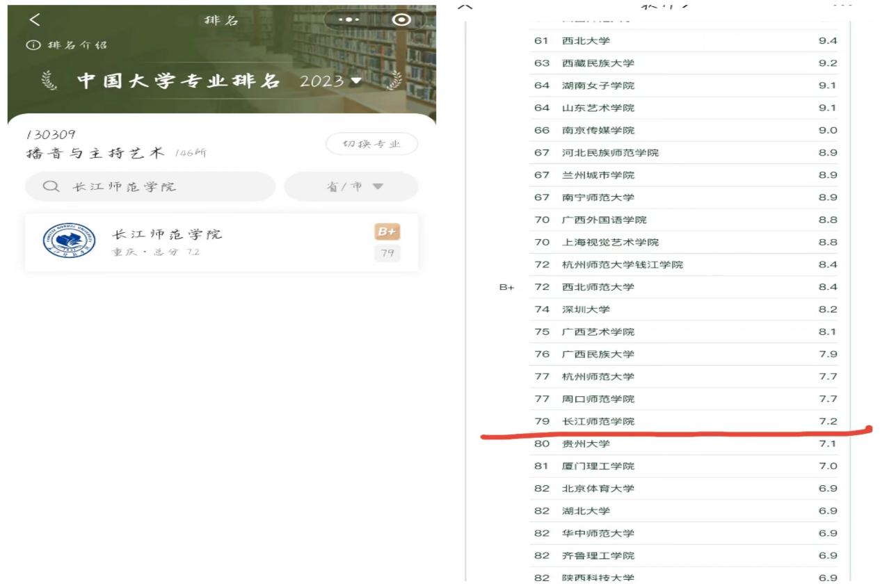 在全国284所开办播音与主持艺术专业高校中,有146所高校上榜,长江师范学院播音与主持艺术专业位于79位,如截图。